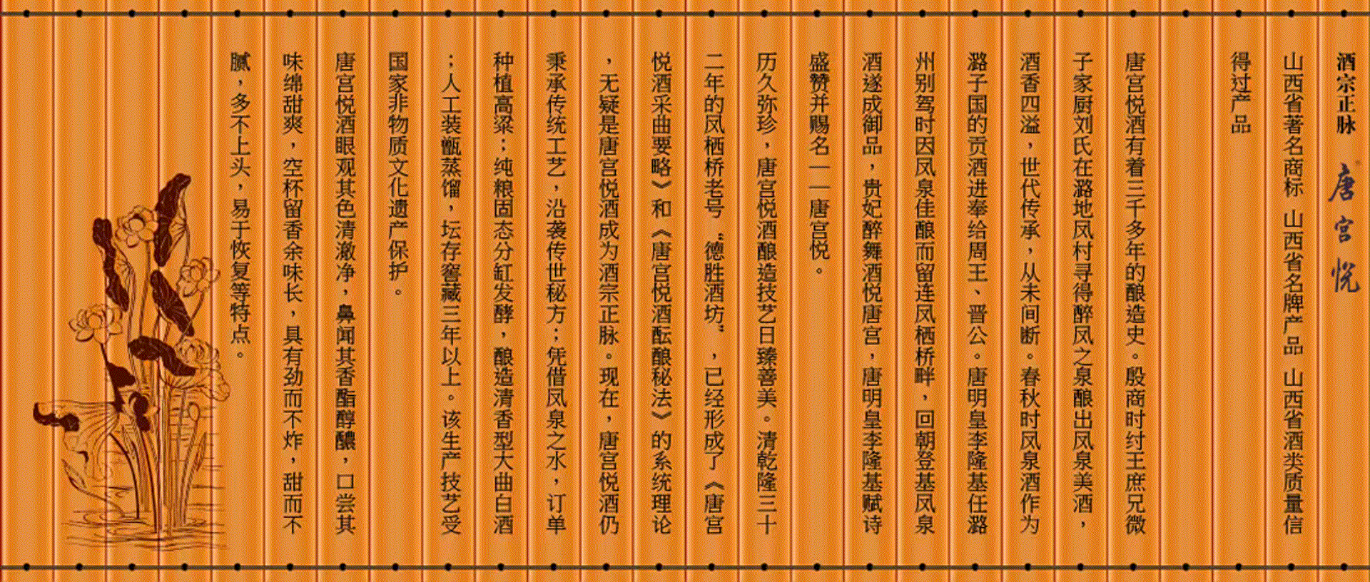 鳳棲橋釀業(yè)有限公司歷史悠久。從殷商微子家廚劉氏尋鳳泉釀酒至今,已有三千多年釀造史。劉氏后裔代傳代善, 才有唐明皇李隆基賜名“唐宮悅”,到清乾隆三十二年的鳳棲橋老號(hào)“德勝酒坊”已形成了《唐宮悅酒采曲要略》和《唐宮悅酒醞釀秘法》的系統(tǒng)理論的系統(tǒng)理論,直至建國(guó)初期的一九五二年才被當(dāng)時(shí)的潞城邊區(qū)酒坊所接管,一九七四年改邊區(qū)酒坊成立國(guó)營(yíng)潞城縣酒廠,二00六年改制為現(xiàn)公司公司地處晉冀豫三省通衢素有“商賈云集旱馬頭”美譽(yù)的微子古鎮(zhèn)……【詳細(xì)